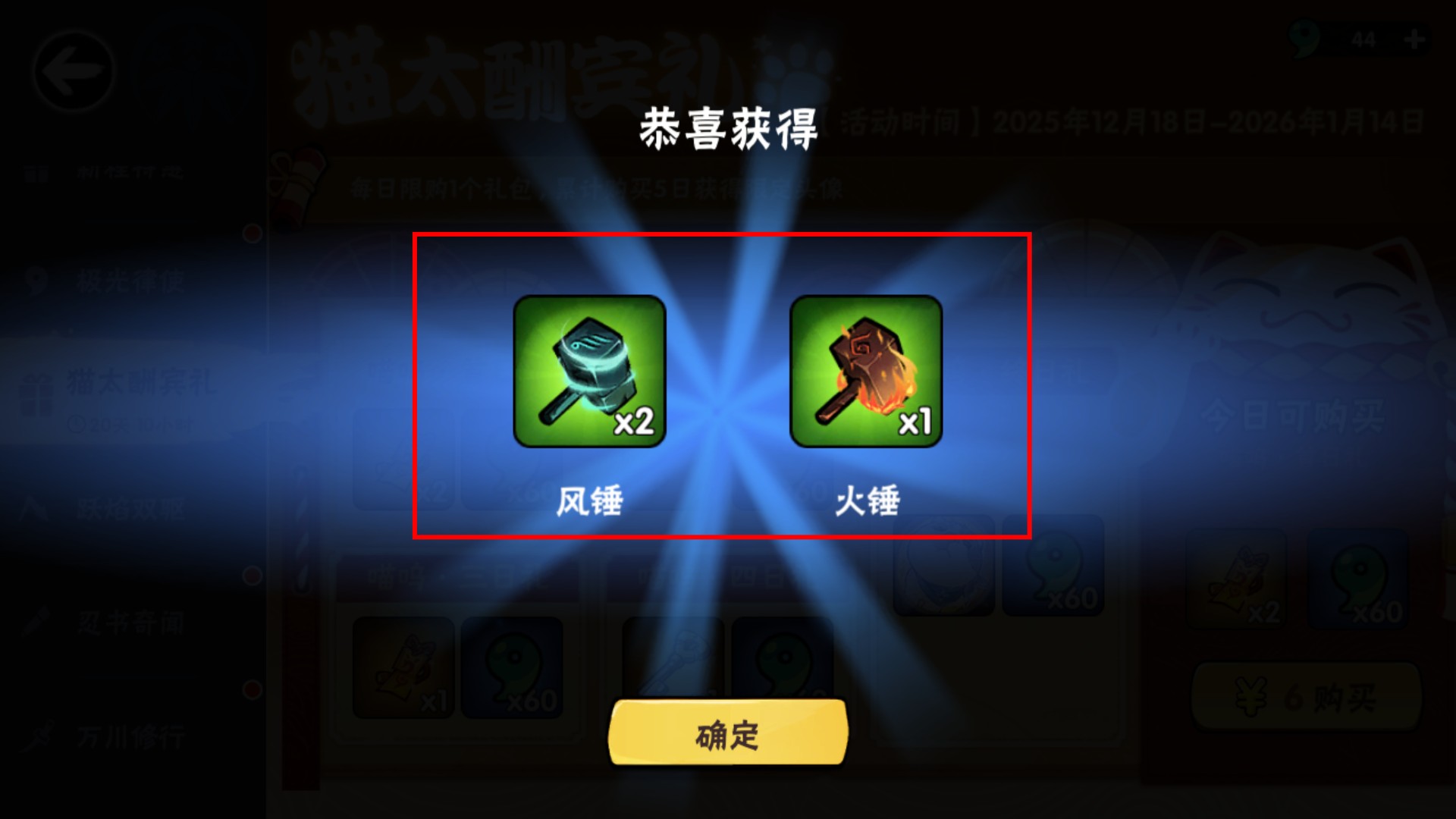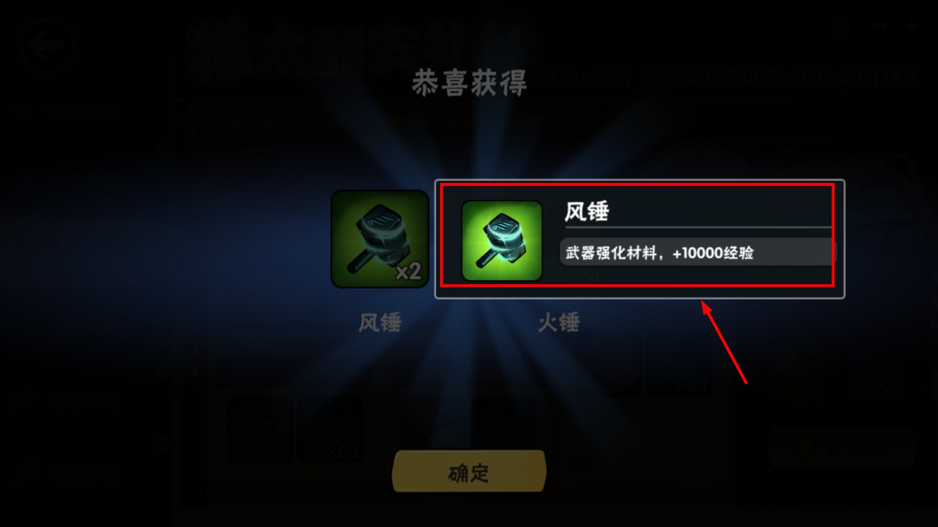 3、通过活动或礼包获取【风锤】-【火锤】,这些武器材料可用于后续的武器强化,提升角色战力。