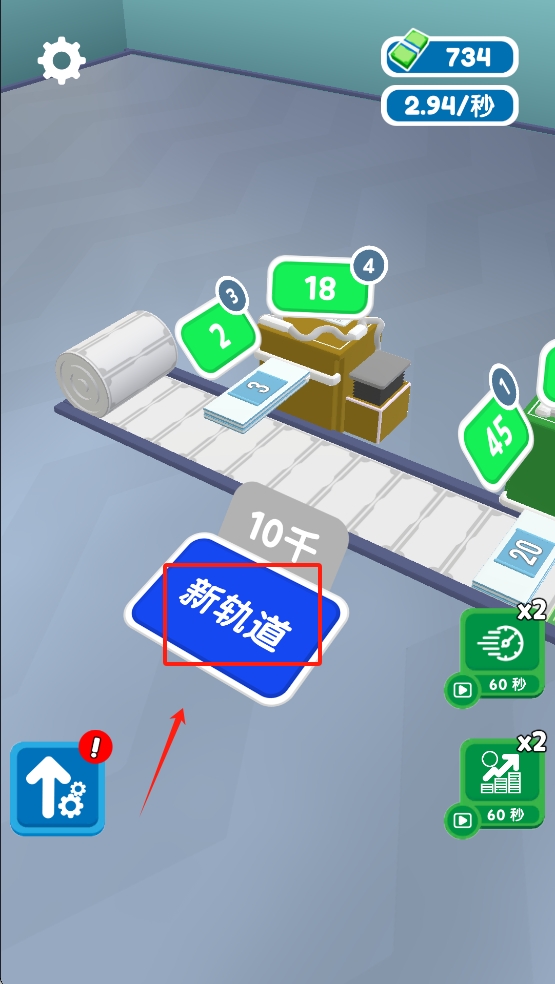 2、数值上升后,点“新轨道”扩线,再开x2加速,让收益跳到0.44/秒以上。