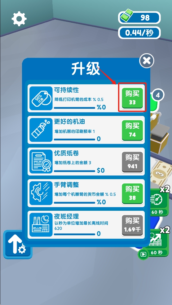 3、进入升级面板,优先点“优质纸卷”加3元,再添“机油”提频,持续滚钱。