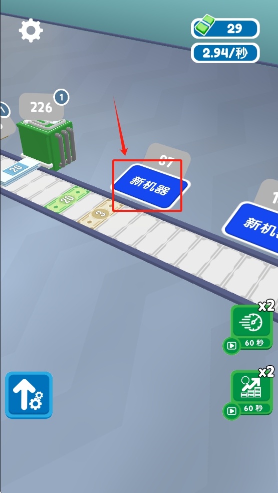 4、重复买“新机器”与轨道,把2.94/秒拉到更高,解锁离线经理,睡觉也生钱。