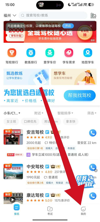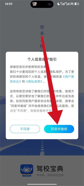 1、打开驾校宝典,在弹窗中点击同意并继续,进入应用首页。