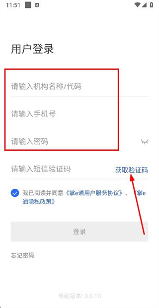 2、在登录页面填写机构名称、手机号、密码后,点击获取验证码按钮。
