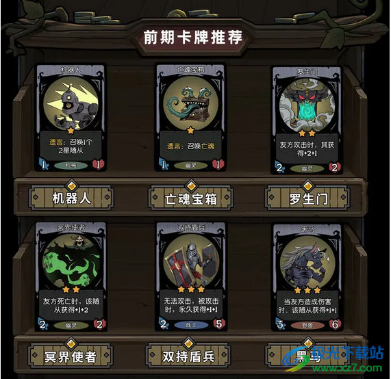 3、前期卡牌推荐:机器人、亡魂宝箱、罗生门、冥界使者、双持盾兵、黑马。