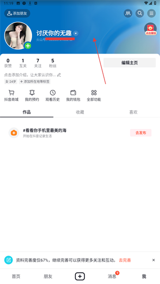 1、打开抖音APP,点击底部导航栏最右侧的我,进入个人中心页面。