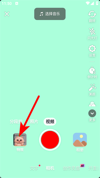 2、在拍摄界面中,点击特效选项,进入特效选择页面。