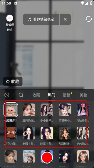 4、选好特效后,点击红色拍摄按钮,即可开始拍摄作品视频。