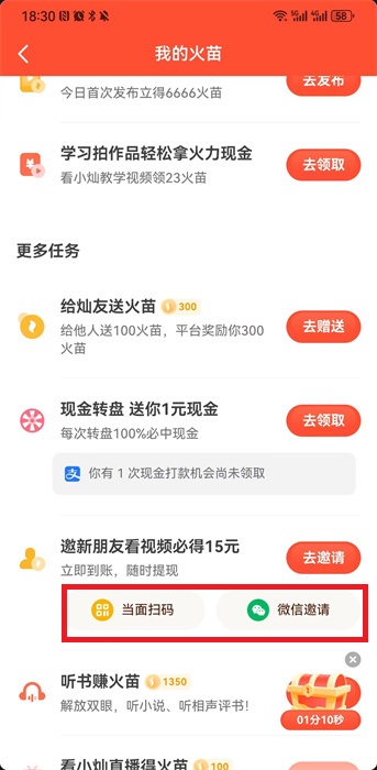 2、用户需要向下翻找任务,在任务之中会有一个【邀新朋友看视频必得15元】就是该邀请好友的任务,可以选择当面邀请、微信邀请;
