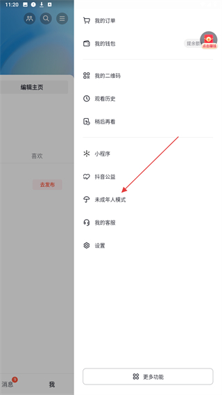 3、在右侧弹出的菜单栏中,点击未成年人模式的按钮。