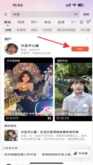 2、在搜索框中输入要关注的抖音号名称,然后点击搜索的功能按钮。