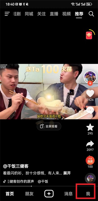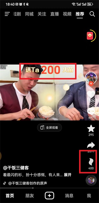 2、在视频作品界面,用户需要点击右下角的【火苗】标志,就可以给作品还有作者赠送火苗,连续点击就可以连续的赠送火苗;