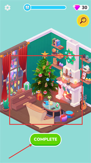 3、将所有装饰物品摆放至对应位置,确认布置完成后点击【COMPLETE】按钮提交成果。