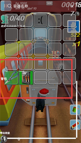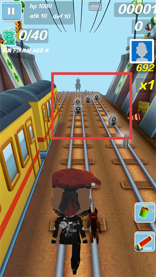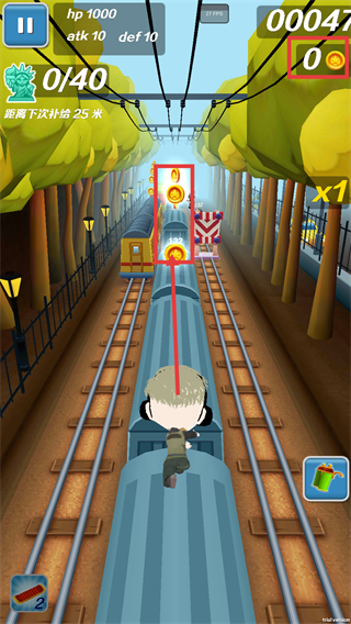 2、跑酷时留意前方【火车】障碍,及时躲避,同时关注【hp-1000】等属性与补给距离,维持角色状态。