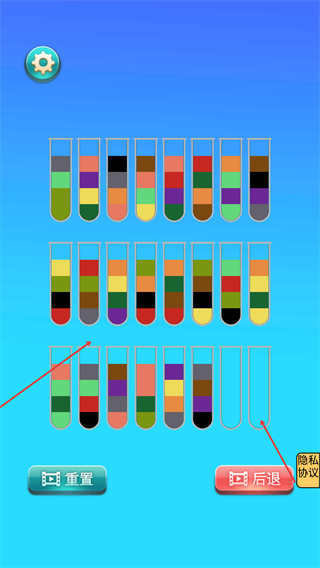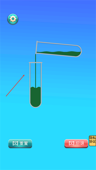 4、在液体分类过程中,通过试管间的液体转移归置同色液体,操作出错时可使用【重置】-【后退】-按钮调整操作进度。
