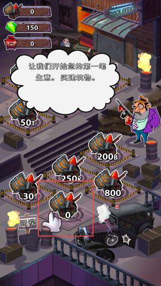 1、进入游戏,根据提示,选择可购买的建筑进行购买。