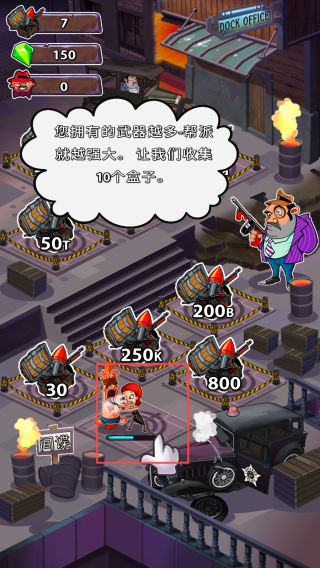 3、依据提示,在游戏中收集武器盒子,增强帮派实力,推进游戏进程。