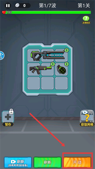 1、战斗前选好【电锯】-【步枪】-【手榴弹】存背包,确认攻击力后点击【开战】开启第一波僵尸挑战。