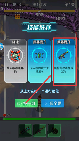 3、波次间隙选技能优先点【武器提升-机枪】,增强主武器攻击力,让后续战斗清怪更高效。