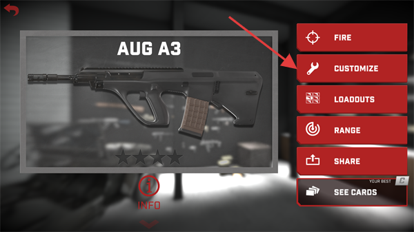 1、选择【AUG-A3】后,点击右侧【CUSTOMIZE】按钮进入自定义界面,可调整枪械外观或配置。