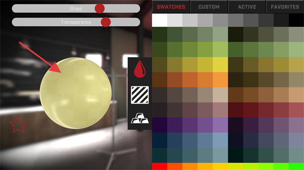 2、在自定义界面,通过滑块调节材质效果,搭配右侧色板设置枪械颜色。