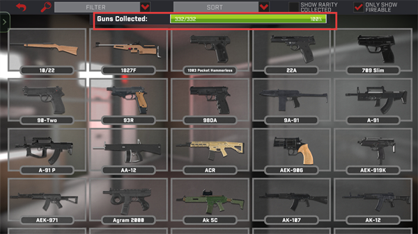 1、在枪械库查看已收集的枪械,可筛选或排序枪械,找到目标武器进行操作。