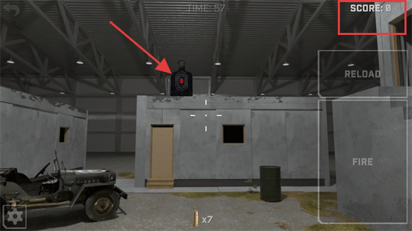 4、进入射击关卡,瞄准目标点击【FIRE】射击,命中积累【SCORE】,弹药不足时点击【RELOAD】补充。