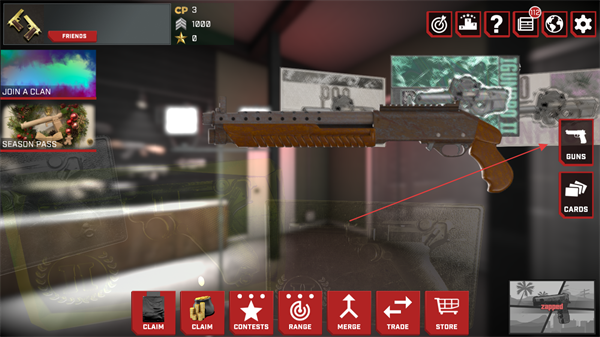 1、进入界面后点击右侧【GUNS】按钮,可查看枪械库,体验枪械。